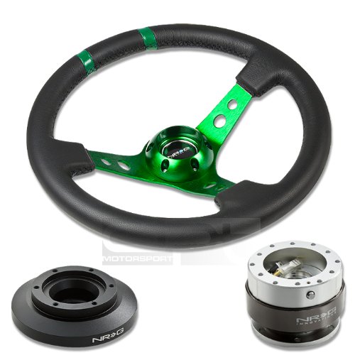 NRG-SRK-E46H+016R-GN+200SL, NRG Innovations 13.78" 350mm 3" Deep Dish Style Black Leather Green Center Marking Green Spokes Racing Steering Wheel Combo with 6 Hole Short Hub Adapter with Gen 2.0 Silver Gold Quick Release Kit SRK-E46H
